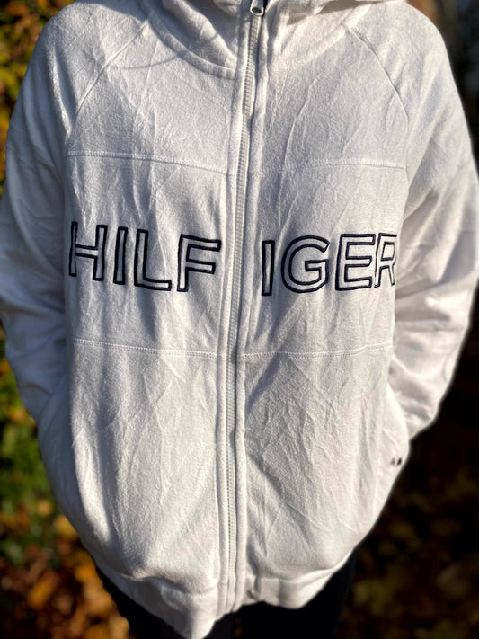 Vintage White Tommy Hilfiger Full Zip Fleece Hoodie Jacket - L/Large