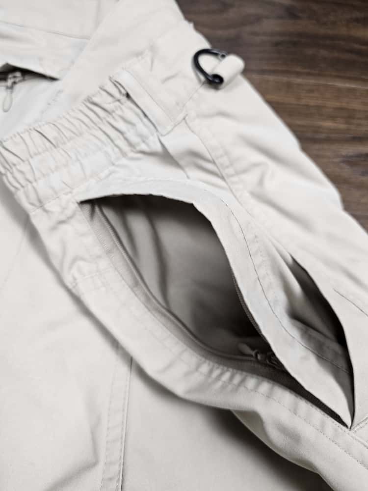 Handy zip pockets, next to the hand pockets, zip rear pockets, and hanging loop for keys/essentials.