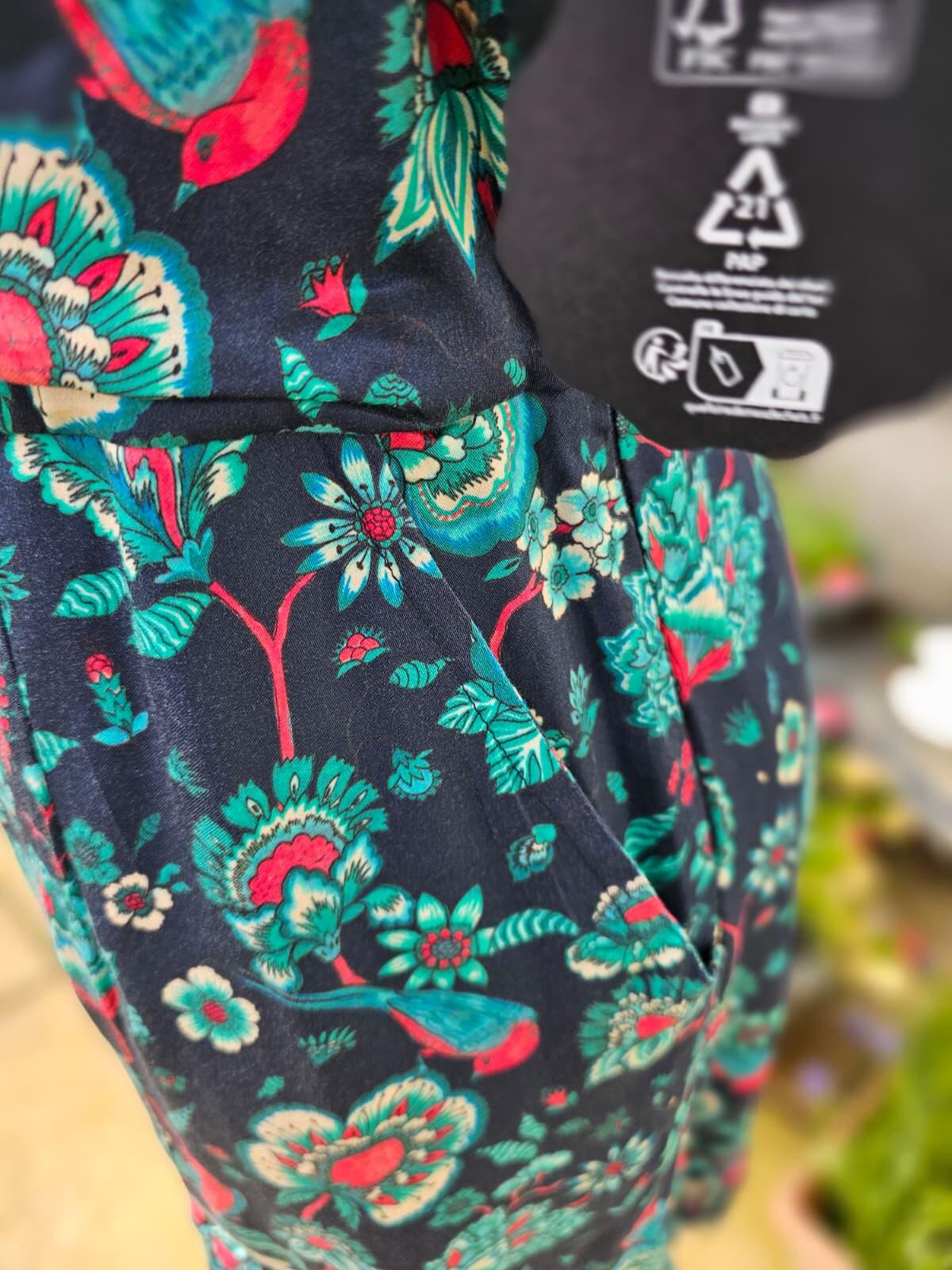 The Caroline Dress is made from our favourite fabric with Livaeco™ Modal fibres in an all-over blue and pink chintz floral bird print on a classic navy background. This vintage-inspired mini dress also features a round neckline, a fitted bodice with shaping darts and elasticated shirring to the back waist to add shape, a self-tie back neck fastening with keyhole detail, elbow-length sleeves with frill details, a concealed underarm zip, and a mini-length skirt with frill details at the hem and slant pockets at the hip.