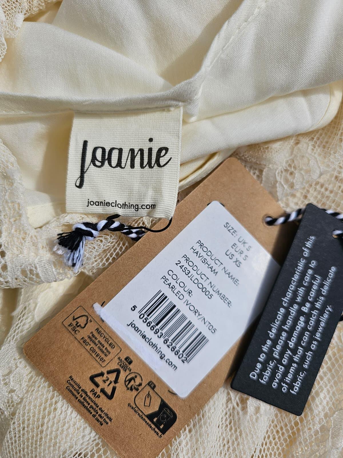 Meet Havisham, the statement midi dress thatโs here to be your new occasion wear go-to. Crafted from ivory Swiss dobby mesh and lace, the Havisham Dress features a removable camisole slip, a high neckline with frill detail, embroidery detail to the front panel, wide, floaty sleeves with frilled edges, a tiered skirt with frill detail, and a loose, dual-sized fit.
