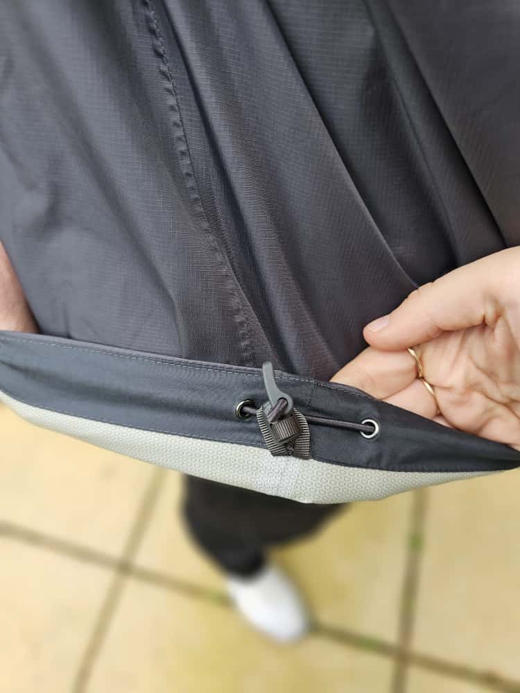 Pullover self-stuffs into torso pocket with carabiner clip-in loop