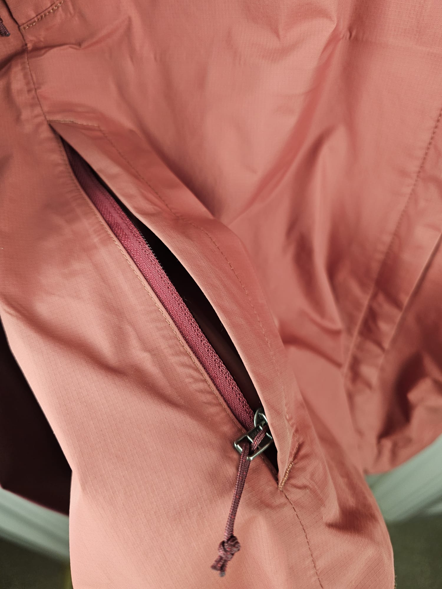 Two zippered handwarmer pockets and venting pit zips; all with welted exterior storm flaps and DWR (durable water repellent)-treated zippers