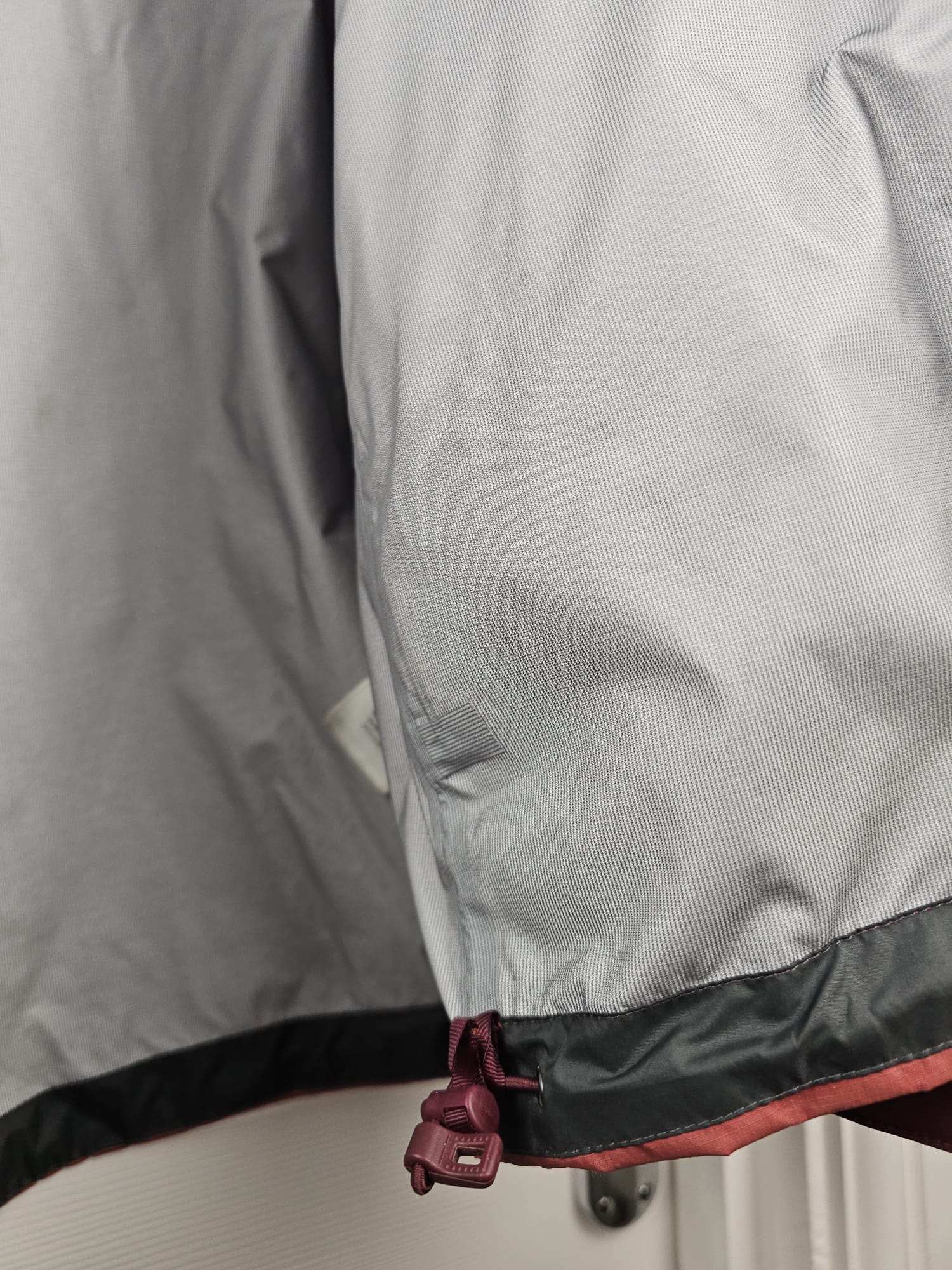 Jacket self-stuffs into left handwarmer pocket with carabiner clip-in loop